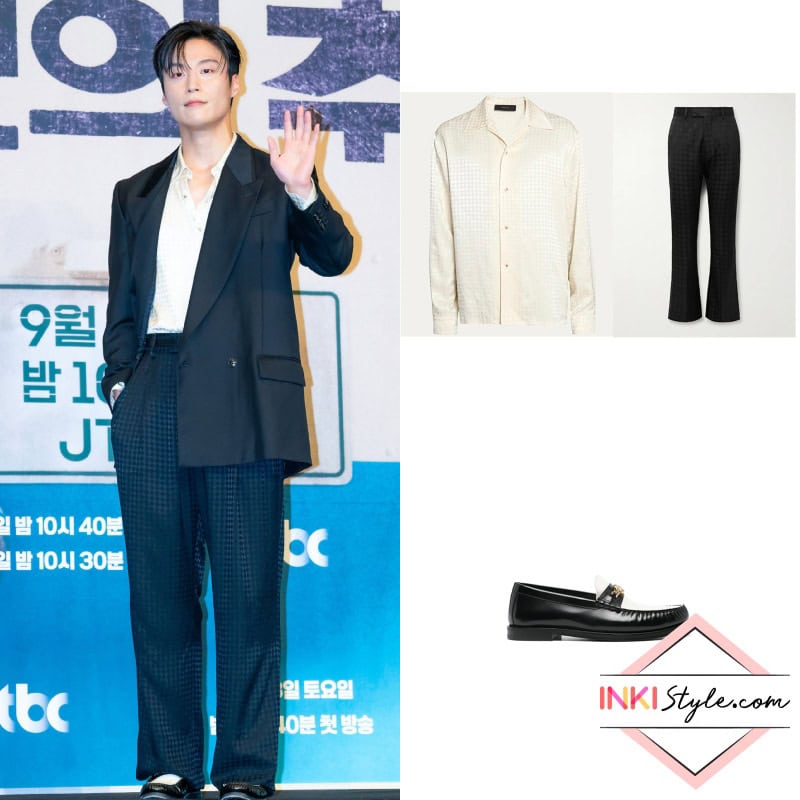 Heo Nam-Jun opted for modern tailoring, donning an AMIRI ensemble that included a viscose shirt and satin jacquard trousers, which he styled with sharp MA Chain loafers.