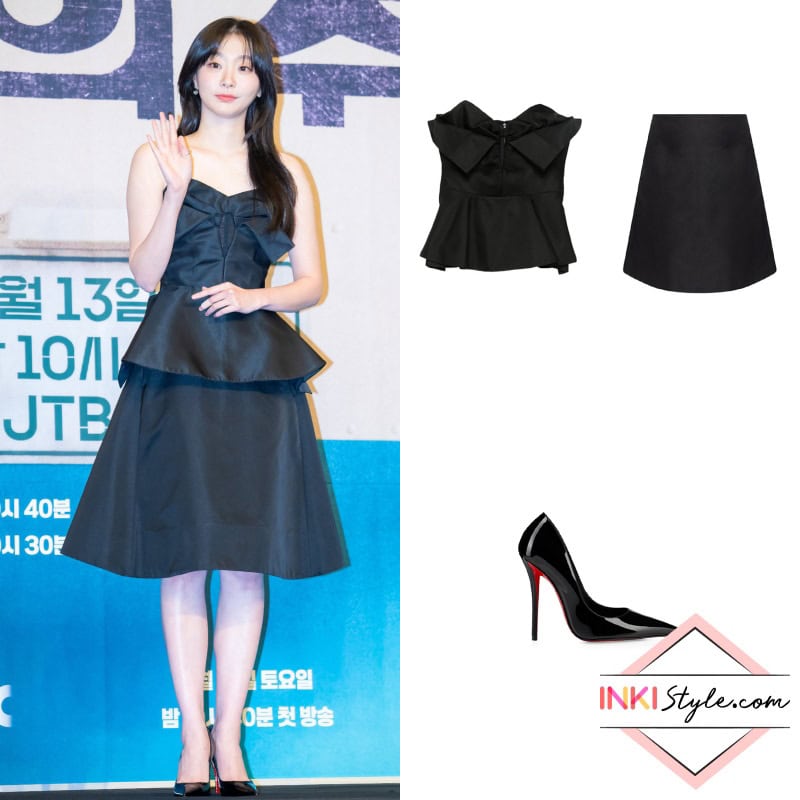 Kim Da-Mi impressed with a refined monochrome look, wearing an Alexander McQueen bow-detailed peplum top and a satin A-line skirt, complemented by glossy Christian Louboutin Miss Z pumps.
