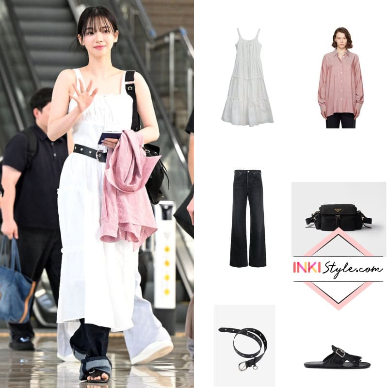 Karina embraced a casual layered look, opting for a breezy Slowlolli ribbon shirring sleeveless maxi dress over Citizens of Humanity Annina wide-leg jeans. She cinched her outfit with a CERRIC eyelet ring belt and complemented it with a Prada Explore medium re-nylon shoulder bag. Karina also carried The Row red Tansy shirt and finished her ensemble with Prada shuffle leather thong sandals, exuding a relaxed yet chic vibe.