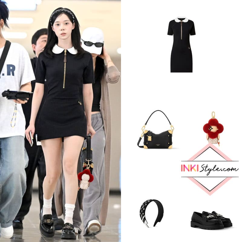 In contrast, Winter adopted a polished preppy style, choosing an all-Louis Vuitton ensemble. She wore a technical jersey Peter Pan collar dress paired with an outline silk headband and district flat loafers. To complete her look, she carried the Side Trunk PM bag and added a playful Vivienne fashionista bag charm.