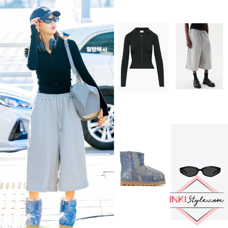 Giselle opted for a casual look, sporting an ARITZIA zip hoodie and DNSR baggy sweatpants, which she elevated with Acne Studios denim boots and Gentle Monster shades.