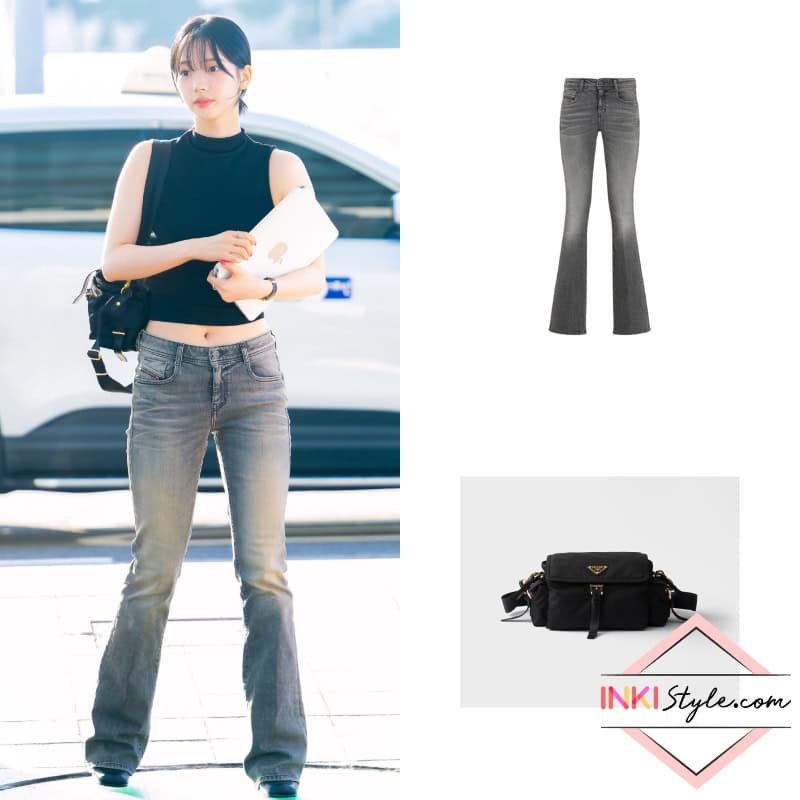 Karina kept it sleek in flared jeans from Diesel and a simple black top, accessorizing with Prada‘s Re-Nylon shoulder bag.