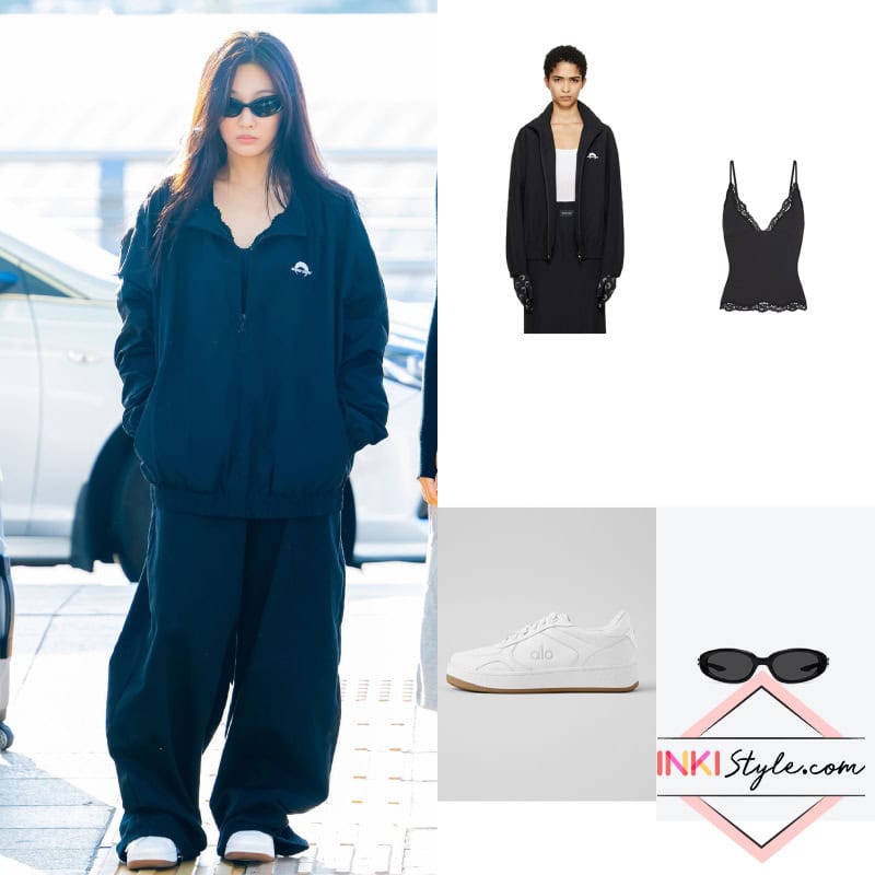 Ningning wore a nylon track jacket by Marine Serre paired with a lace-trimmed cami from Skims. She completed her outfit with Alo Yoga sneakers and Gentle Monster sunglasses, achieving a sporty yet feminine vibe.