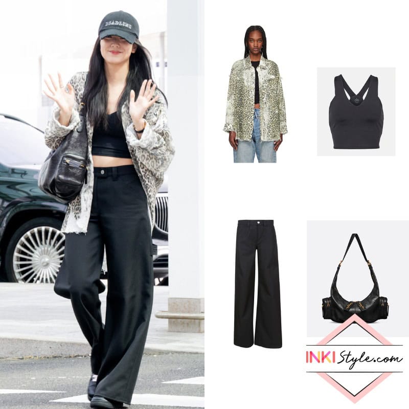 Jisoo layered an R13 shredded seam drop neck shirt over an Alo yoga airbrush real sports bra, pairing it with Courrèges twill baggy pants. She completed her look with a classic Dior saddle bag, effortlessly blending casual and chic.