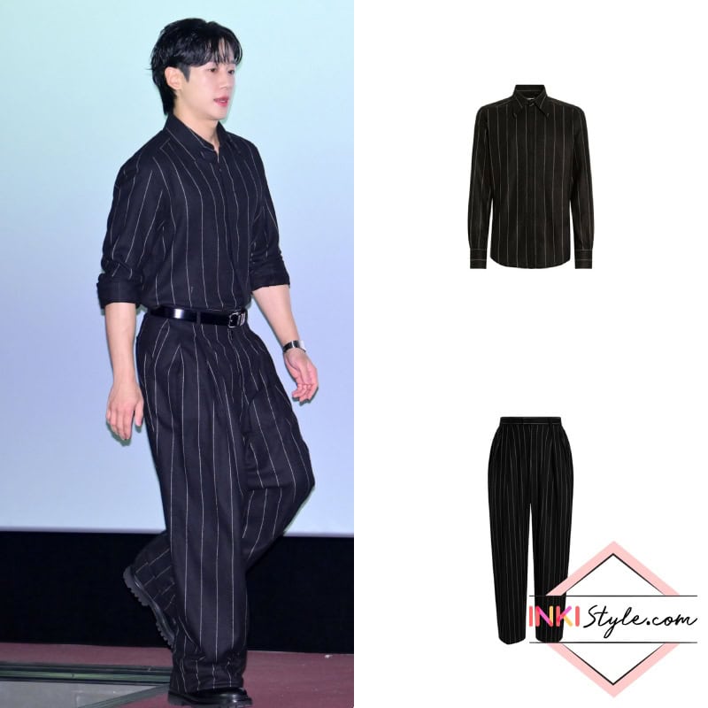For the event, he wore a refined ensemble from Dolce & Gabbana, including a pinstripe long-sleeved shirt and pinstripe pleated trousers. His sleek, monochrome look perfectly balanced sophistication with modern flair. With his soft hairstyle and understated accessories, Jung Hae-In demonstrated that minimalism can be striking when executed effectively.