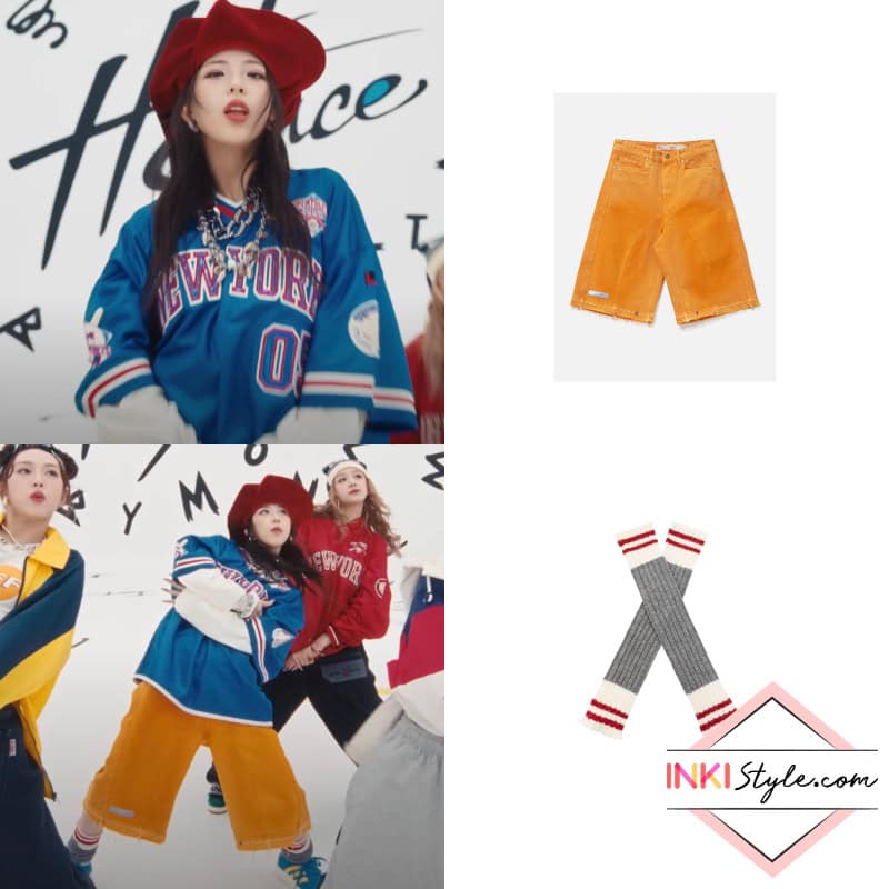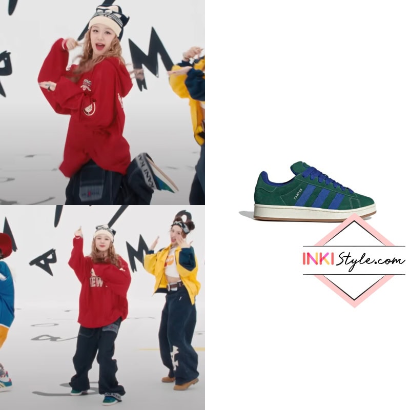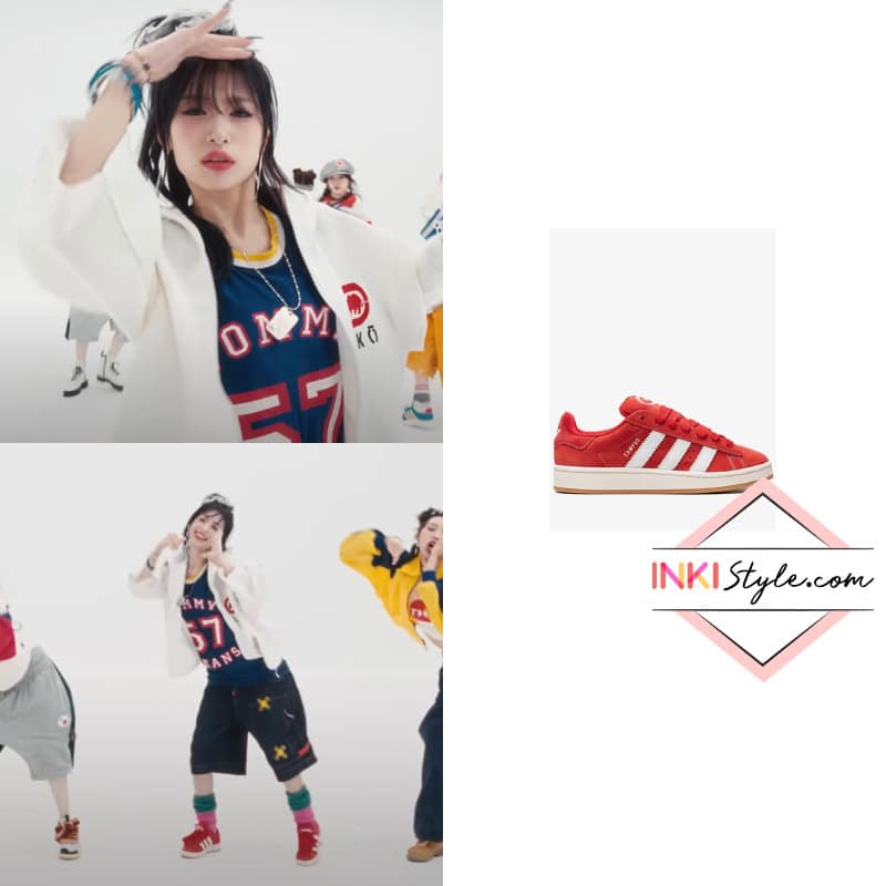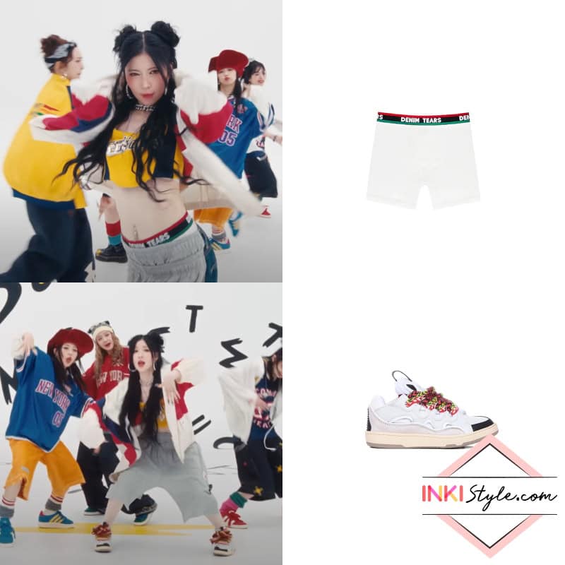 Ahyeon is a style diva in a colorful logo tee, white zip up top, baggy shorts, and a pair of sneakers in from Adidas.