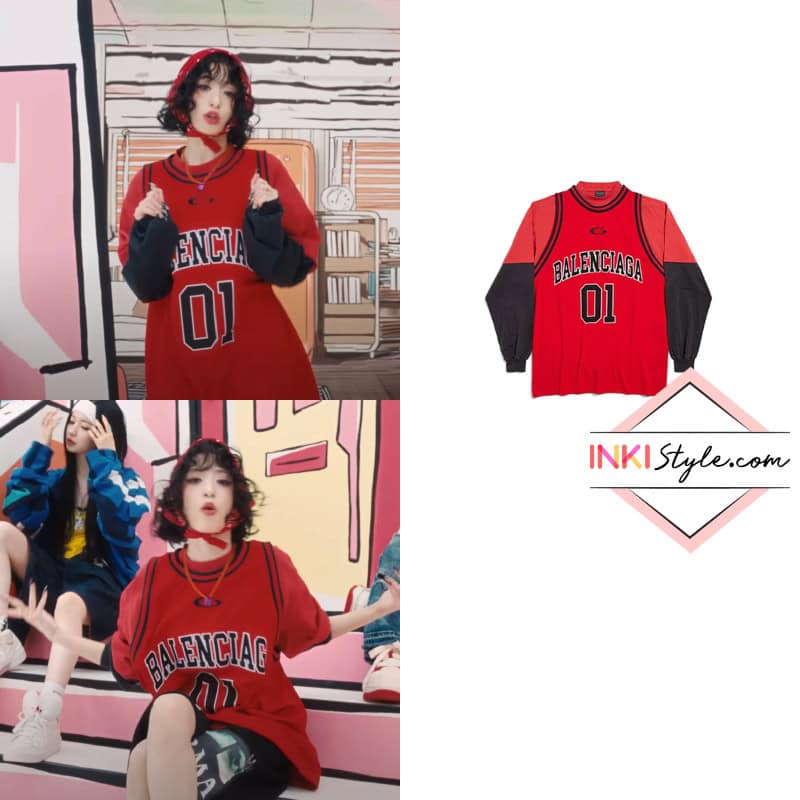 She’s eye-catching in this red and black men’s basketball series layered long-sleeve T-shirt from Balenciaga.