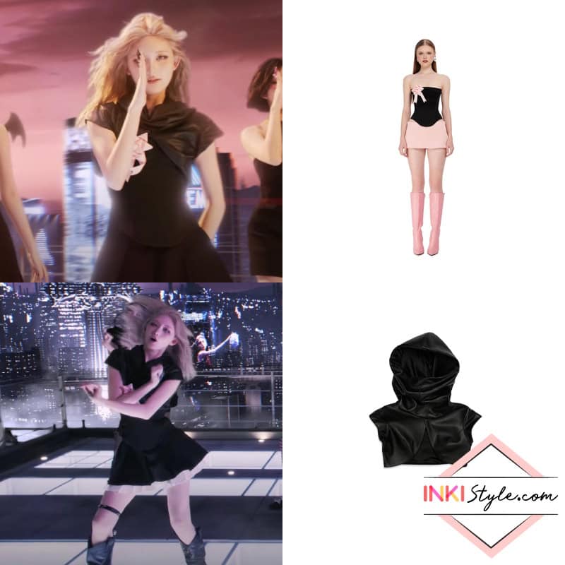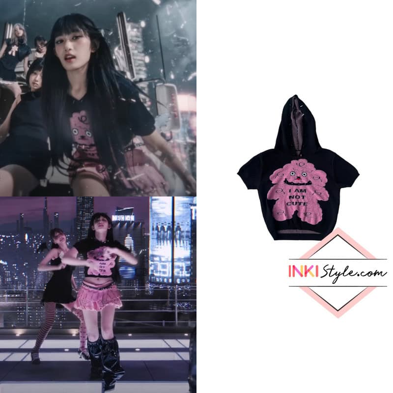 Leeseo adds playfulness to a girly grunge look by pairing a candy pink mini skirt with a black and pink Holly knit hoodie from Celine Kwan.