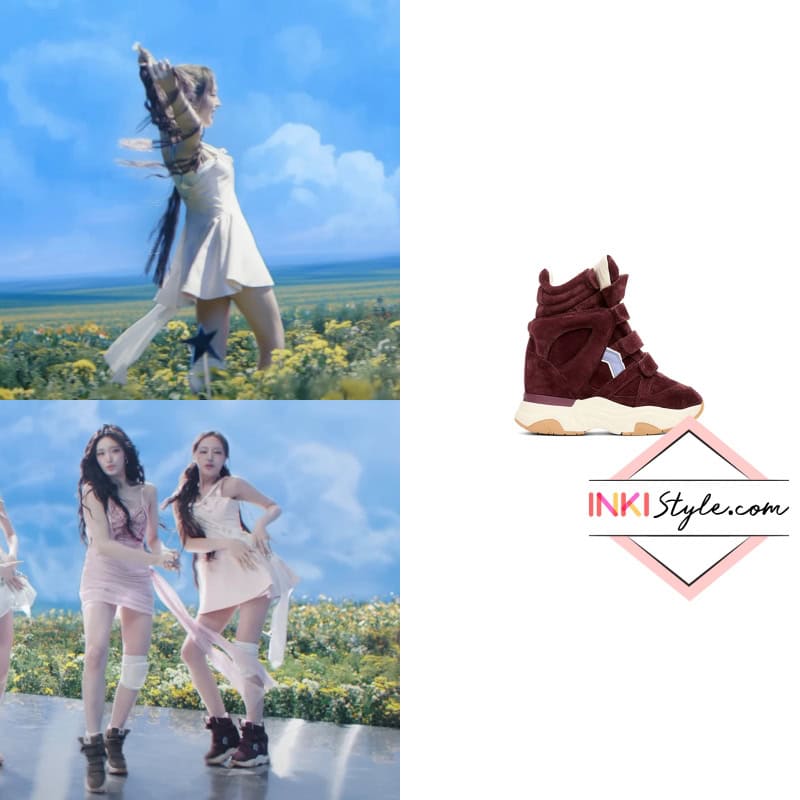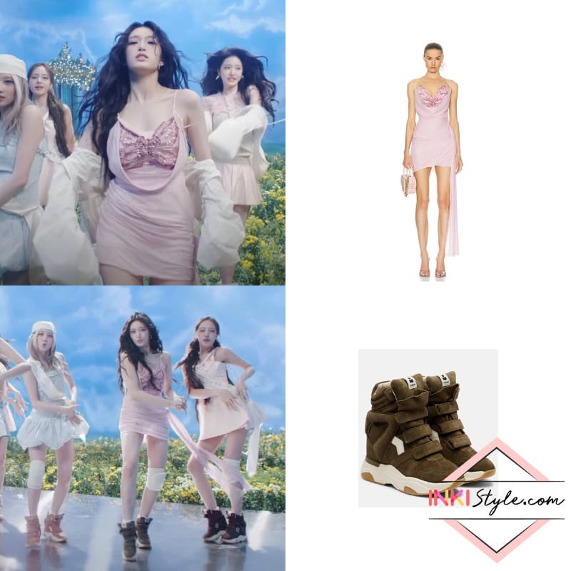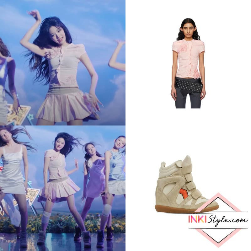 Wonyoung captivates everyone in this pink Bindweeds silk top from Fanci Club and beige Bekett sneakers from Isabel Marant.