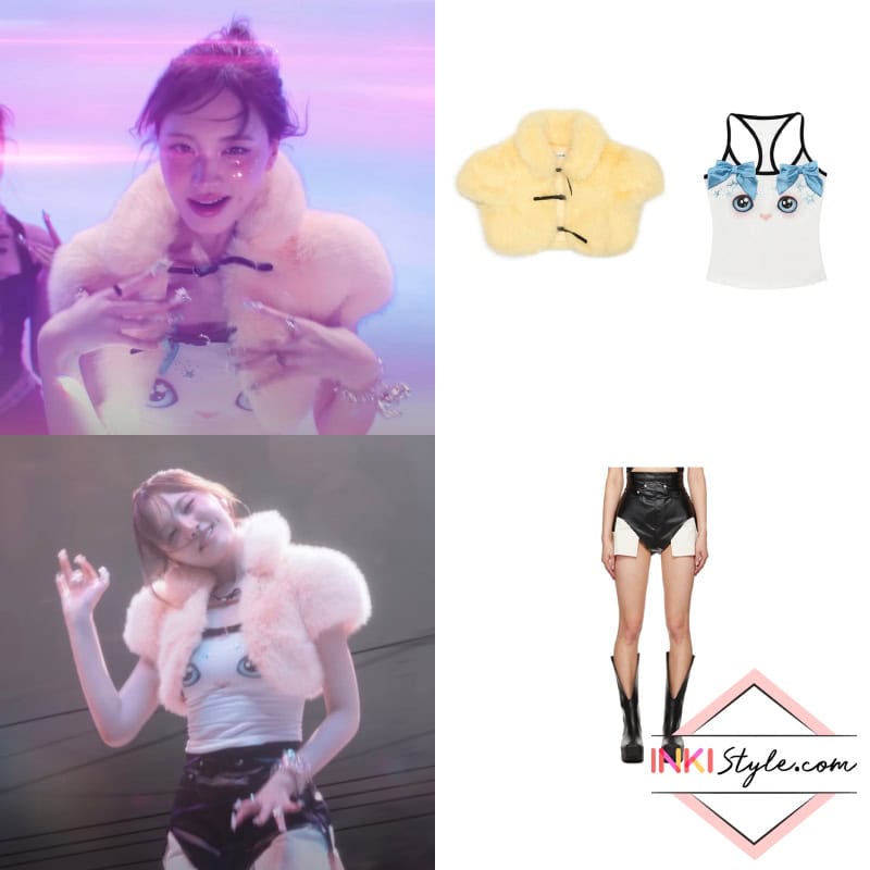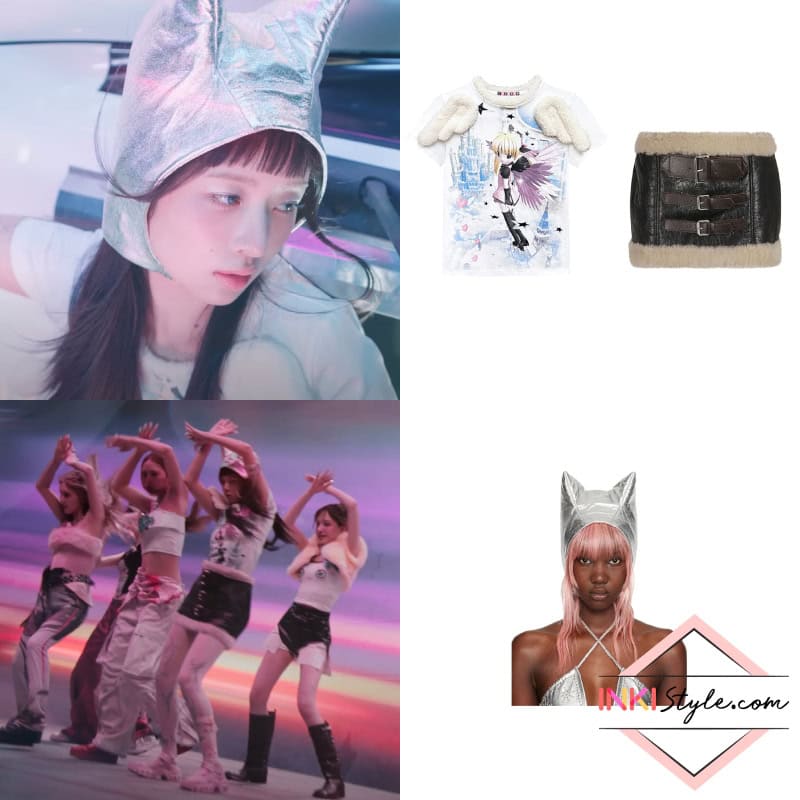 The K-pop star nails this anime-inspired look as she dons a Heaven Angel T-shirt from Cfierce and a fur trim belted short skirt from Blumarine. She added a touch of whimsy to her outfit with a silver Mimi Wade edition cat leather hat from I’m Sorry by Petra Collins.