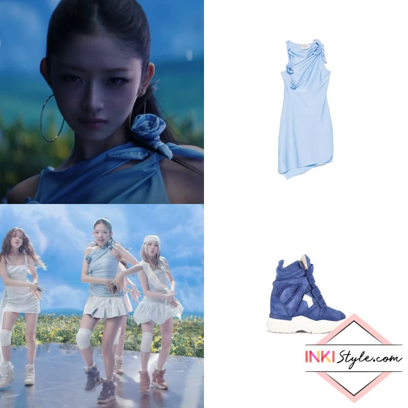 Rei gets her glam on in a sky blue asymmetric flower mini dress from Coperni and blue and white Balskee sneakers from Isabel Marant.