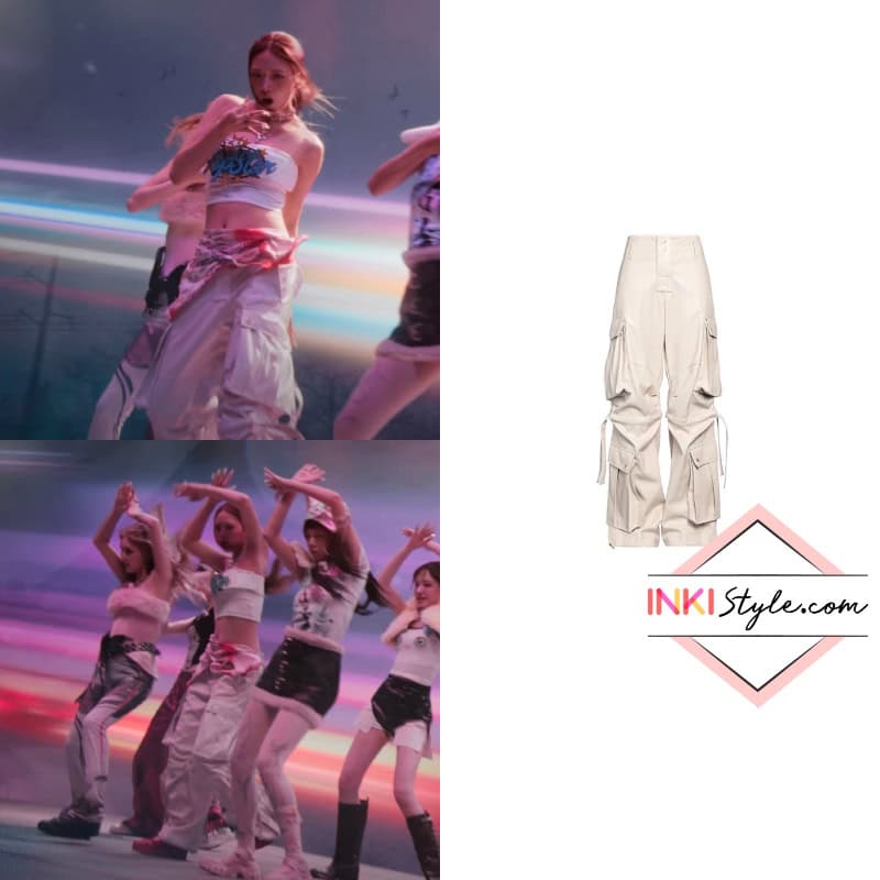 Yujin‘s got the it-girl factor in this cropped printed tube top and cream cargo pants from DarkPark.