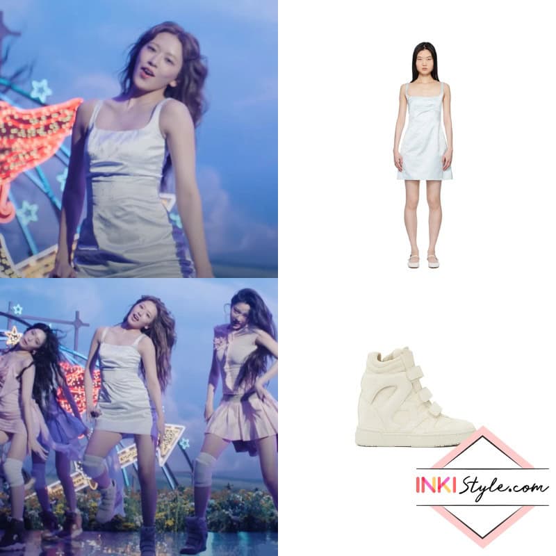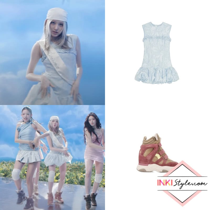 Gaeul radiates sweet innocence in this cloque corset mini dress from Ganni and a pair of Balskee sneakers from Isabel Marant.