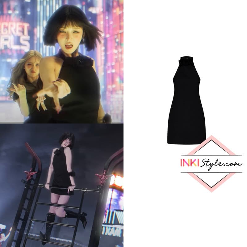 Rei is everyone’s favorite gothic disco queen in this black flower detailed halter mini dress from Dolce & Gabbana.