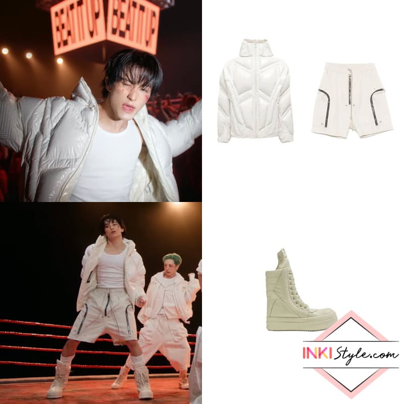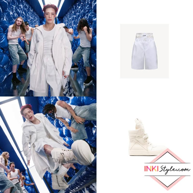 Jeno turns heads in Moncler x A$AP Rocky logo shorts, paired with Rick Owens lace-up zip fastening sneakers, creating a clean white look with high-fashion appeal.