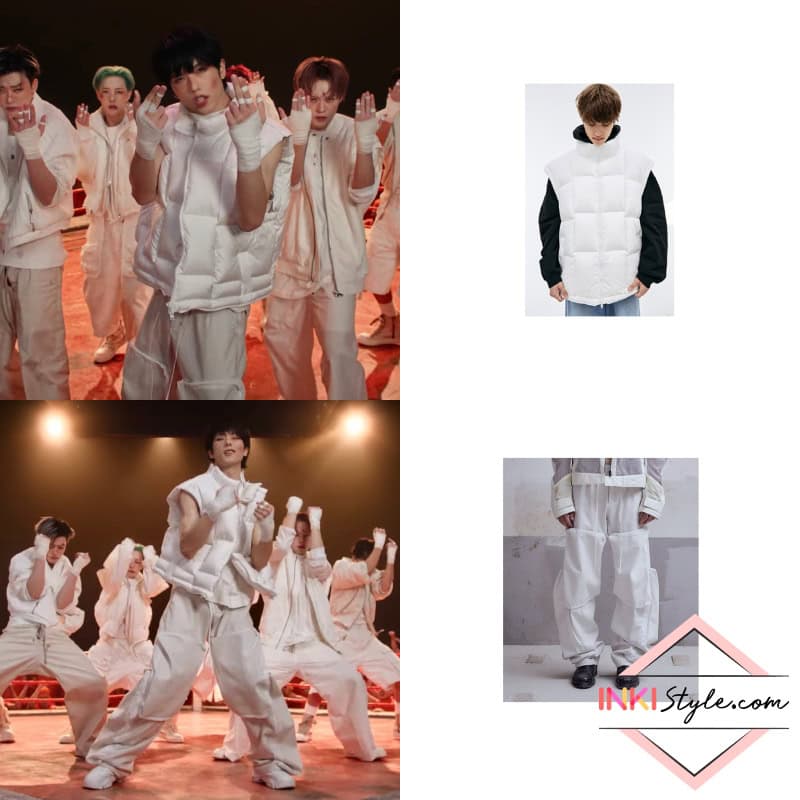 Jisung rocks a dimensional all-white look with a Vetements down vest and Carnet Archive Ruined Mass denim trousers, blending luxe outerwear with conceptual denim distressing.