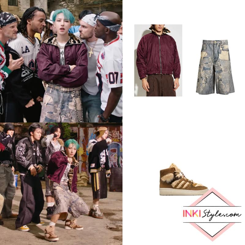 Renjun delivers a playful yet fashion-forward ensemble with a PDF reversible patterned jacket, Kamiya trompe l’oeil print shorts, and Adidas Rivalry Hi Star Wars Chewbacca sneakers. This look perfectly captures Renjun’s fun personality while maintaining serious style credentials.