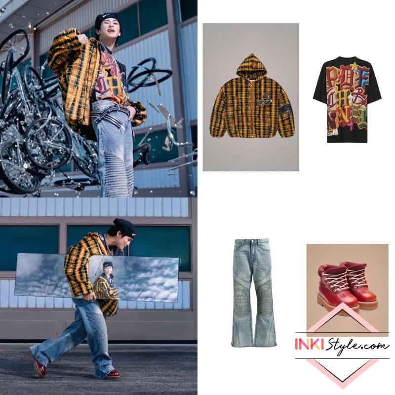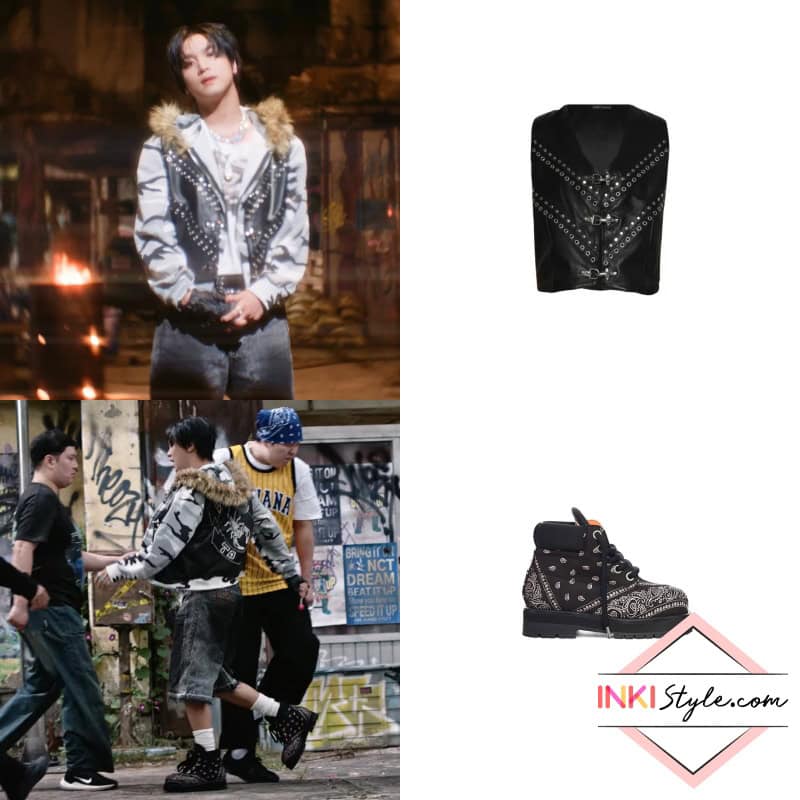 Haechan brings unique footwear into the spotlight with PDF bandana print boots, complemented by an Earthling VIP ‘Come Out To Play’ waistcoat. This combination of edgy prints and layered styling creates a look that’s purely Haechan.
