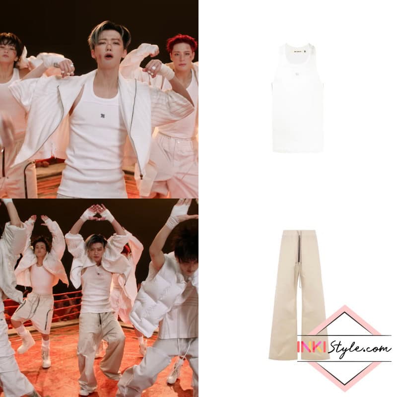 Jaemin kicks things off with a minimal yet striking outfit featuring a MISBHV crew-neck racerback tank top paired with Rick Owens Bela wide-leg trousers.