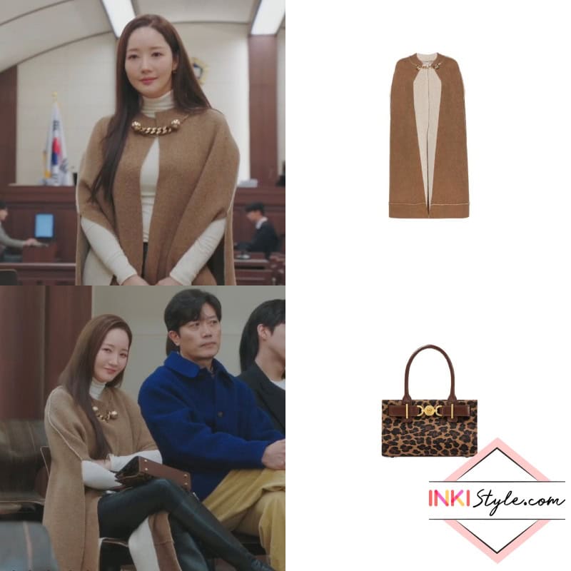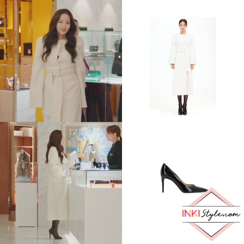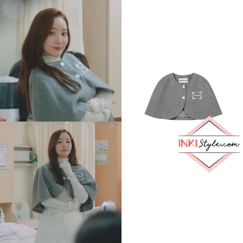 In episode 5, Min-Young made a sophisticated statement in a mini wool cape from MINJUKIM, featuring elegant button details and a soft grey-blue hue paired with a crisp white turtleneck.