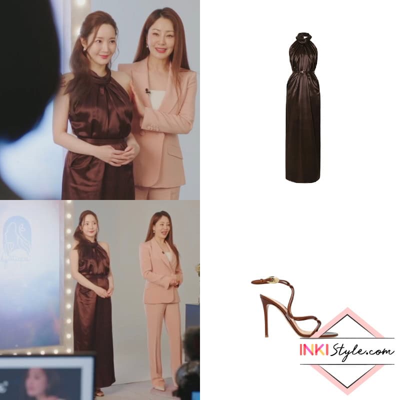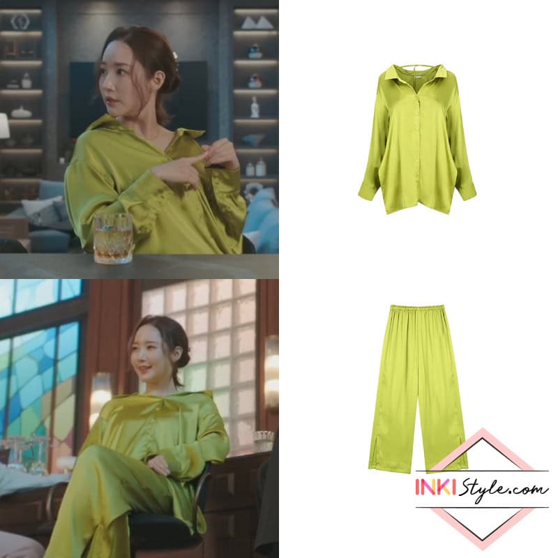 Min-Young radiated vibrancy in a silky blouse and pants set from DAZE DAYZ, creating a bold monochromatic moment with lustrous fabric that commanded attention.