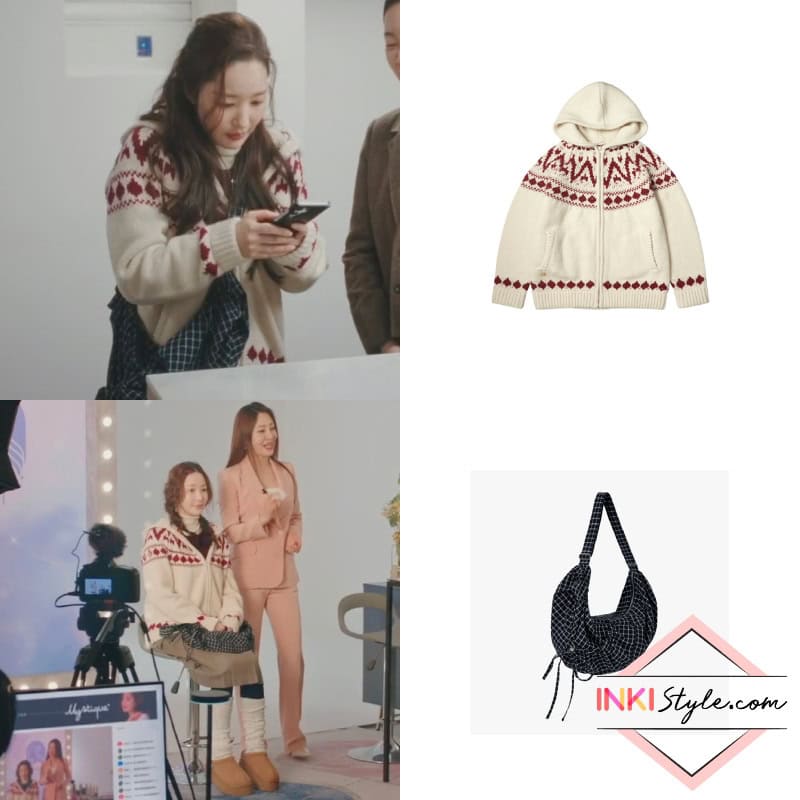 She embraced cozy charm in a Nordic knit hooded zip-up cardigan in cream from VANONE ATELIER, layered over a turtleneck and paired with a check navy Lassie bag from Fennec and knee-high socks for a playfully relaxed vibe.