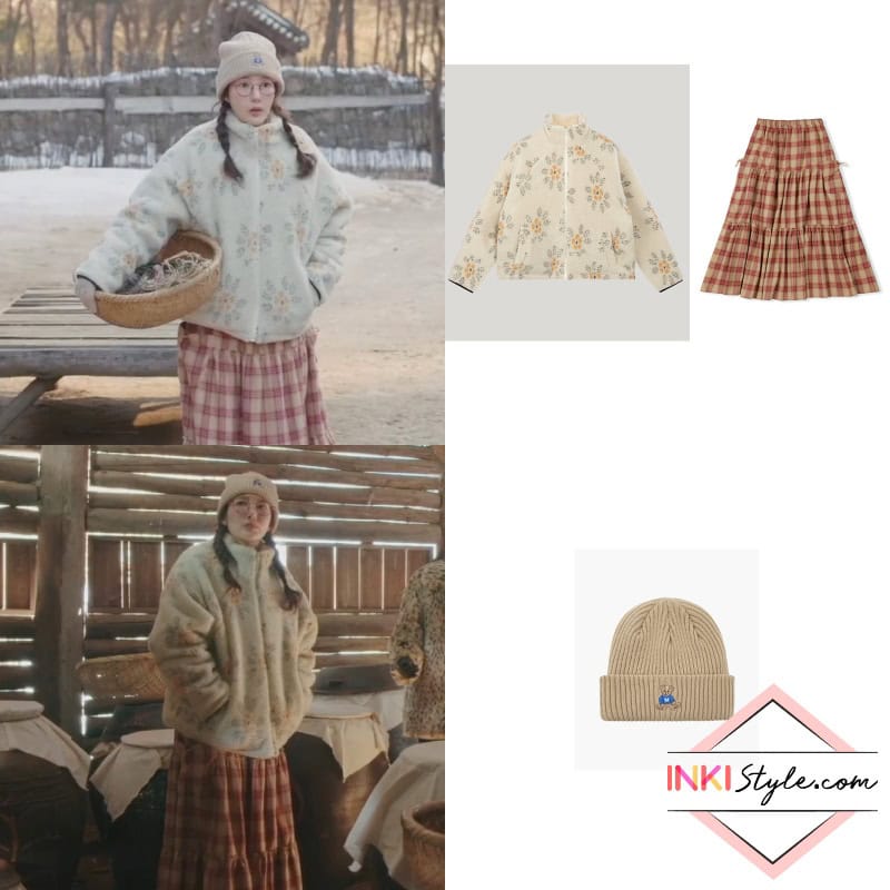 In episode 8, Min-Young transformed into a rustic charm with an ivory flower dumble jacket from Poete, layered over a cream turtleneck and paired with a red ruffle maxi skirt from FRITUR. She completed the countryside-inspired look with a beige Doodle Bear beanie from Marithé François Girbaud and round spectacles.