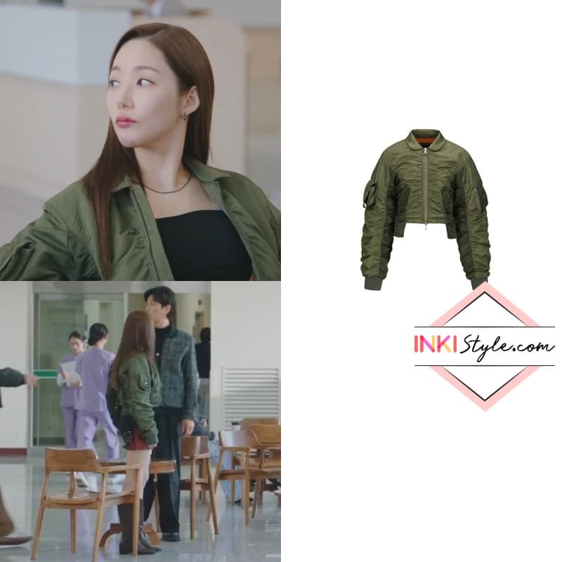 She channeled effortless cool in a khaki lace-up bomber jacket from ANDERSSON BELL, styled over a black tube top and accessorized with a delicate chain necklace, creating an edgy yet refined aesthetic.