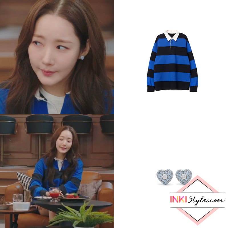 In a departure from her typical glam, she opted for sporty sophistication with an embroidered rugby top in blue from MAISONMARAIS, accessorized with elegant Idyllia stud earrings from Swarovski.
