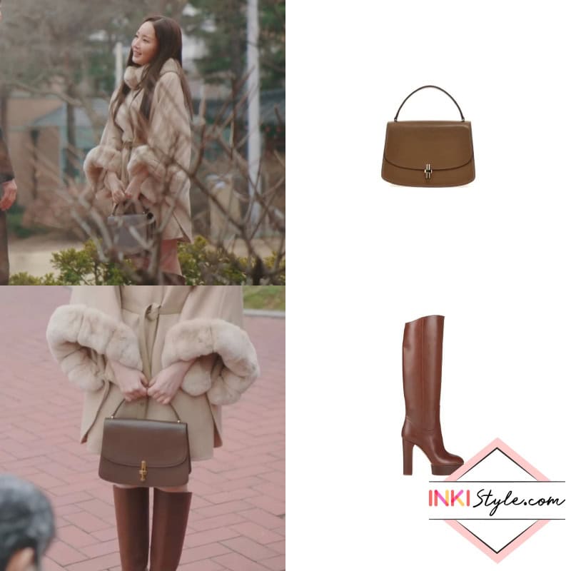 In episode 7, Min-Young wrapped herself in pure luxury with a plush cream faux fur coat, styled with a Sofia 10.00 handbag from The Row and sleek boots from Casadei.