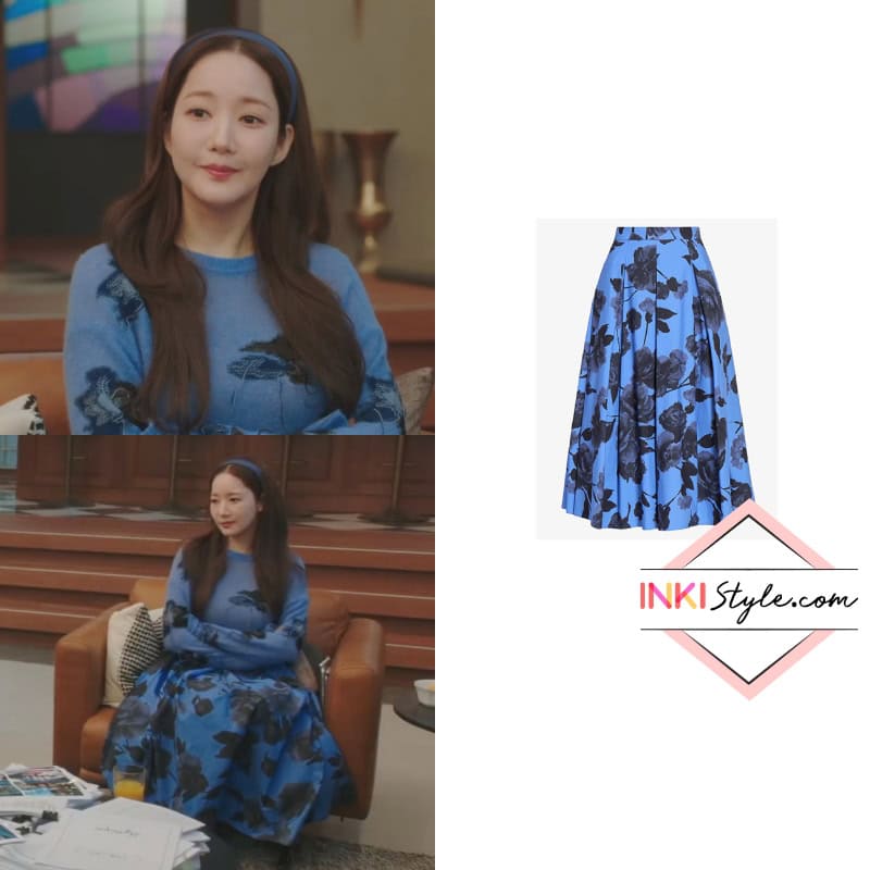 Min-Young brought a touch of romance with a vibrant blue floral cotton midi skirt from Erdem.