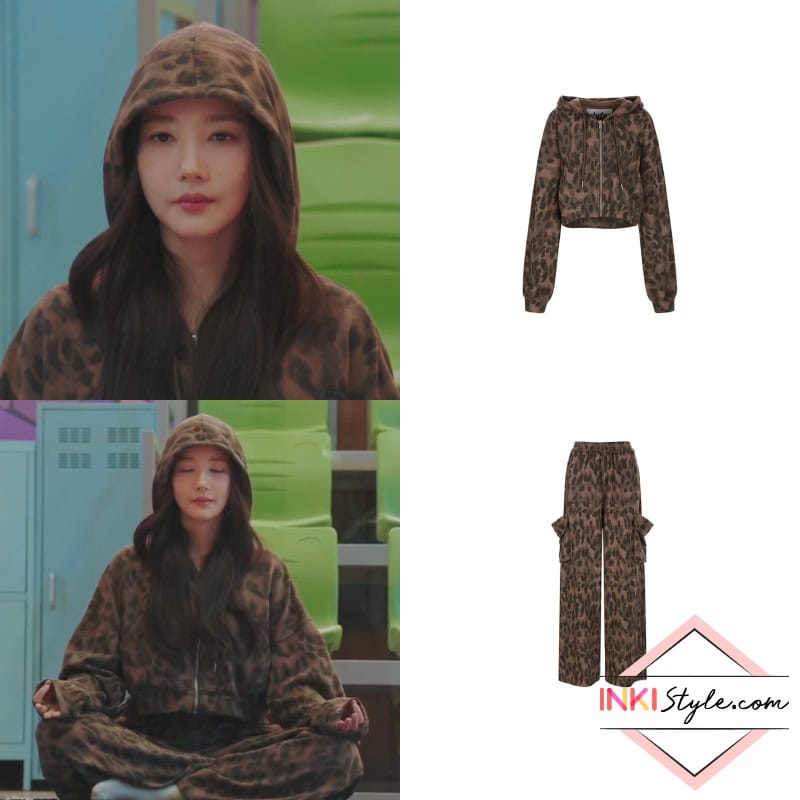 She embraced athleisure with attitude in a leopard print zip-up hoodie and matching wide sweatpants in brown from LALAFOX, proving that even her most casual moments exude personality.