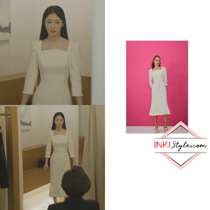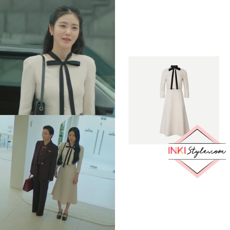 Ye-Eun exudes quiet sophistication in a cream TOWAV Merry Tie Dress, which is finished with a black ribbon accent.