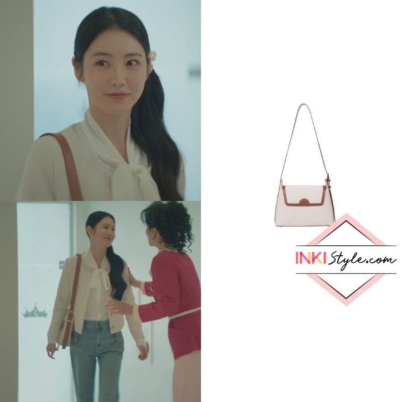 She pairs a white tie-neck blouse with blue jeans and accessorizes with a brown bag from VALLUAT. This timeless combination strikes a perfect balance between casual comfort and put-together elegance.
